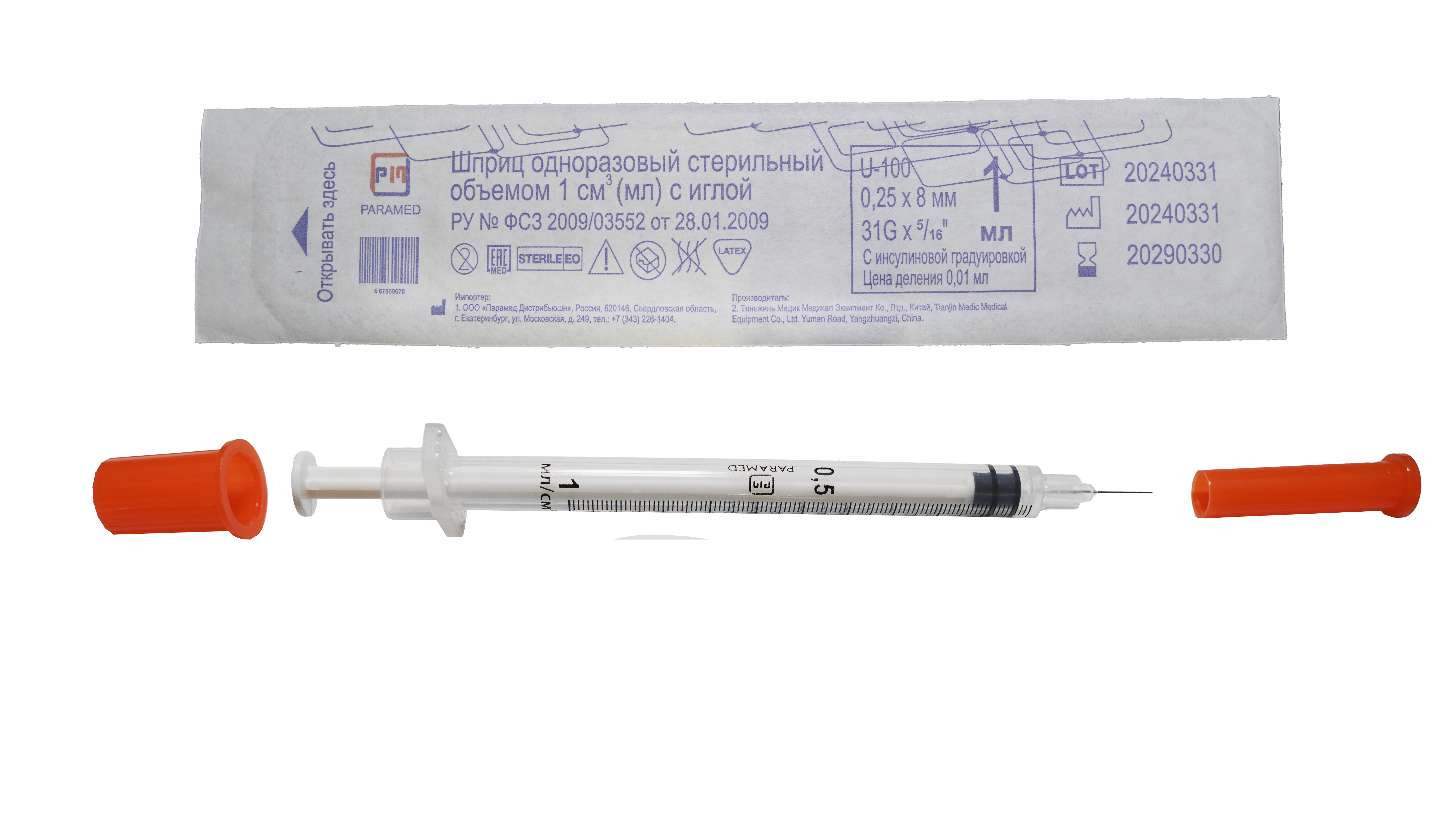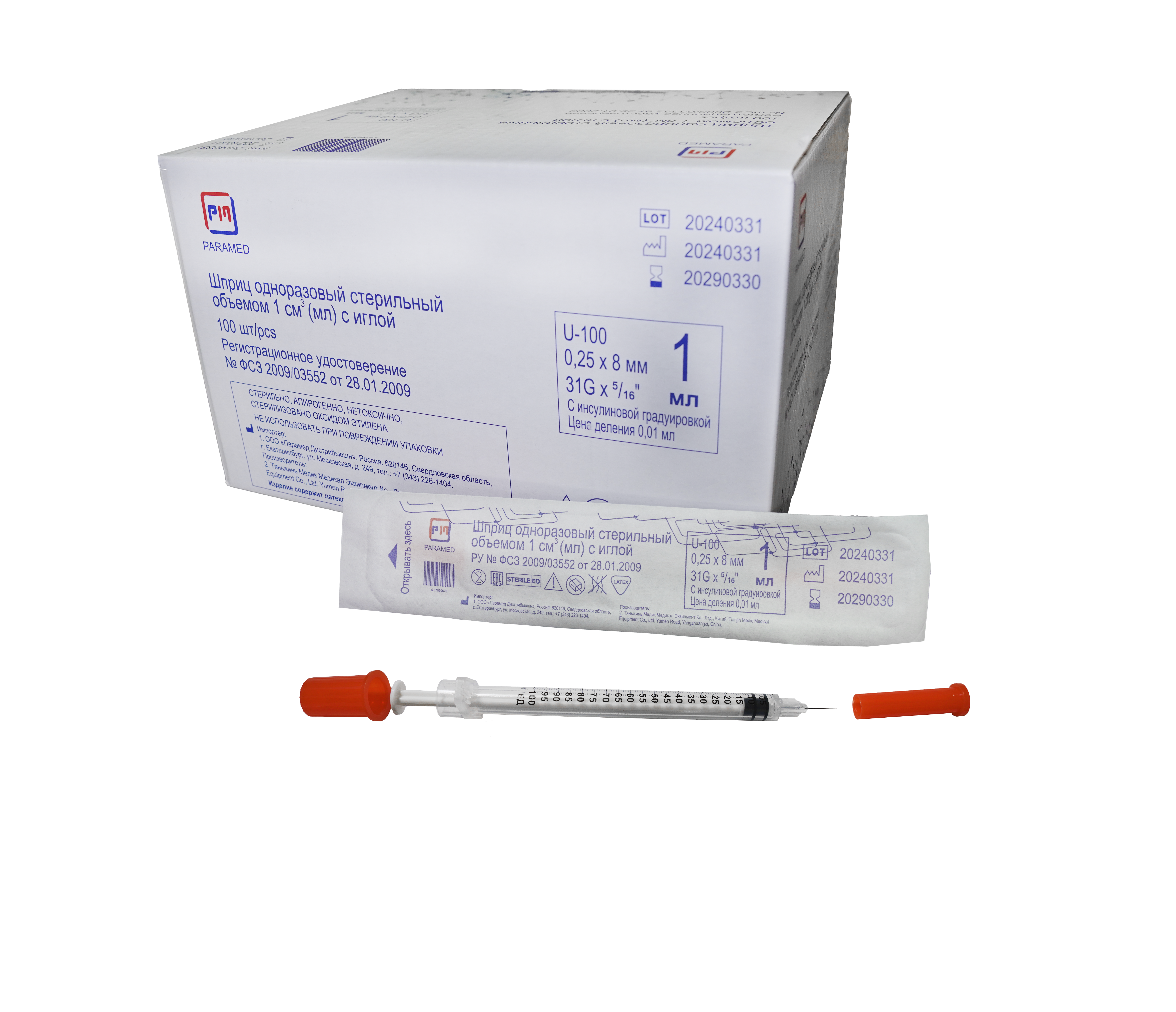 1 мл Шприц стандарт стерил U-100, с инсулин град., с иглой 0.25*8 мм1 (31G x 5/16) 100 шт