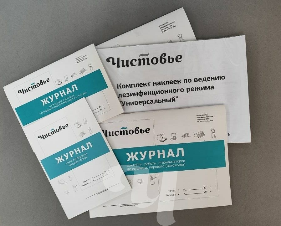 В комплект входит: 1. журнал контроля работы стерилизаторов воздушного, парового (автоклава), 2. журнал учета качества предстерилизационной обработки, 3. журнал учета проведения генеральных уборок, 4. журнал учета проведения текущих уборок, 5. журнал регистрации и контроля ультрафиолетовой бактерицидной установки, 6. книга учета получения и расходования дезинфицирующих средств для проведения дезинфекционных мероприятий на объектах, 7. журнал регистрации инструктажа на рабочем месте, 8. комплект универсальных наклеек по ведению дезинфекционного режима.